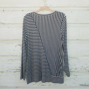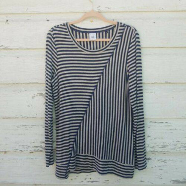 CAbi Tunic Top Tee T-shirt Size Medium Navy Tan Striped #3228 Ernest. Long sleeves, round neckline. The fabric is 97% rayon, 3% spandex. Excellent pre-owned condition, goes with anything. Measurements: Bust (underarm to underarm): 20" flat, Hem: 22" flat length (shoulder to hem): 29". Non-smoking home. See p...