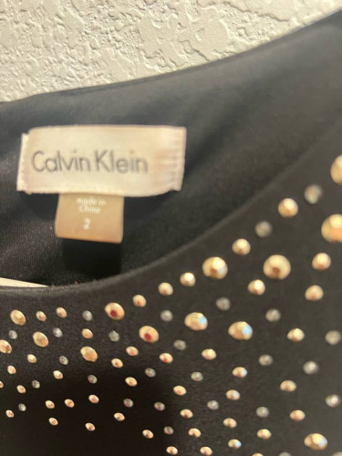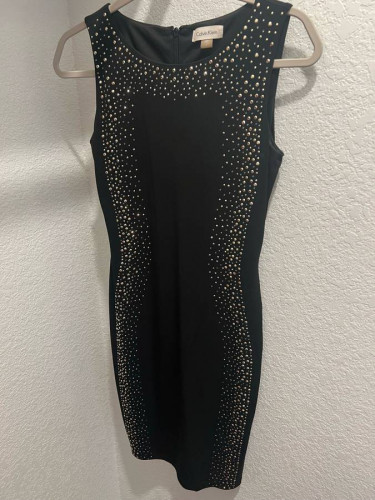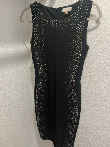 Elegant yet fun and stylish evening dress with intricate gold sequins that curve around an hour glass figure. Above the knee length depending on height 5’7-5’9 size 2 - contours around figure. Beautiful dress in tip top shape - like new !