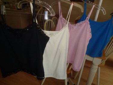 Cami Tops - George Cami - Sz.L - white w/lace in front - Avon Cami - blue - Sz. M - St Johns Bay - lavender - Sz. L - St Johns Bay - black - Sz. L - all have extra layer of material at bust area -never worn - smoke/pet free home - $10.00 each
