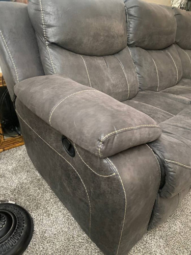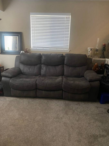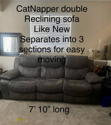 Only used for a few months and had to relocate. I hate to part with it, but I do not have room in the new house. It is in excellent condition! Non-smoking home. European contemporary style double reclining sofa. Dark taupe color goes well with about any decor. See close-up for details in the photos....