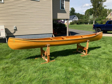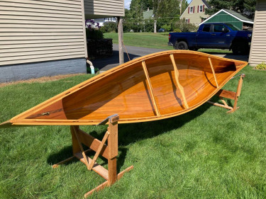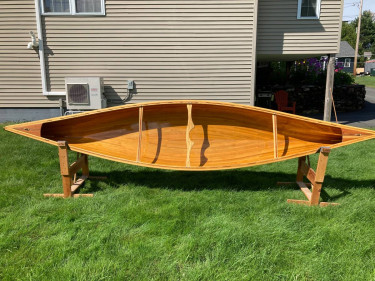 This is a 15’ cedar strip canoe that was handmade by my father. Weighs about 50 lbs and is 36” wide at the beam. All strips are white cedar and they’re joined by bead and cove method. Gunnels, yoke and thwarts are ash. Bow and stern decks are cherry with brass cleats. Keel is ash and capped with a brass band ...