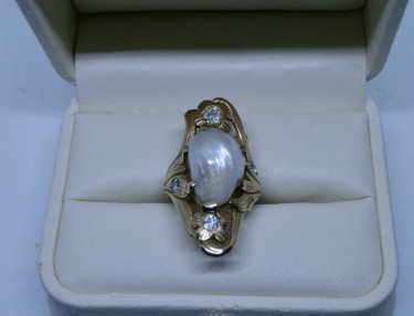 Classic pearl and diamond 14k gold ring. Ring features one baroque mabe pearl in a six prong head. Pearl was rated good in luster with a color of white with light rose overtones. Pearl is 11mm wide and 15mm tall. Set around the pearl are four round brilliant cut diamonds with an approximate weight of .38 cara...