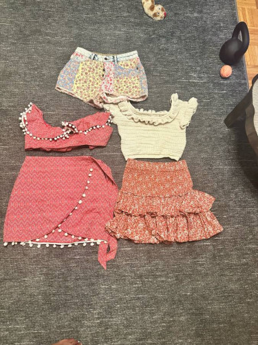 Everything is in excellent condition. No rips, flaws or stains. All true to size except where noted. Most worn once. ASOS skirt set- 8 $59 Farm rio for Anthropologie shorts-8 $59 H&M cream crochet top- med $20 Ann Taylor red floral skirt- small $29 Zara blue floral jumpsuit- Med $29 Free People bl...