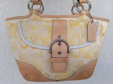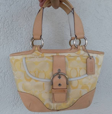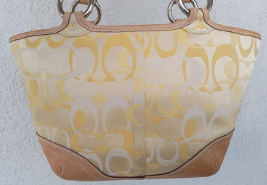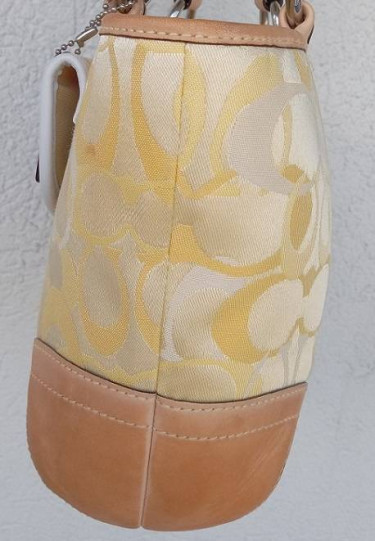 OUTSTANDING with a black mark on front buckle strap and very faint dot near top on side. Bottom leather has faint rub lines. Yellow + Nude Leather! 18 yrs old + SUPERB++ Brand: Coach---Style: Shoulder Bag---Size: Small/Medium---Material: Jacquard, Leather---Closure: Top Zip Pattern: Signature C---Main Co...