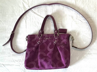 Hello Folks! This is a used Coach bag but looks fairly new. You can carry it by hand or attach the adjustable strap to wear it as a crossbody or shoulder bag. Top zip closure. Multi function pocket inside. Condition: Used but looks fairly new Manufacturer: Coach Color: Purple Cost: $30 Deliv...