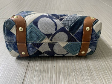 This is an authentic Coach Carly patchwork hobo shoulder handbag, model 12215. The strap is made of brown leather with brass(?) hardware. Approximate measurements: Width is 12" at top and 10" at base; Height is 8"; Depth is 4" at the base. This handbag has three inner pockets and an inner key ring. The ...
