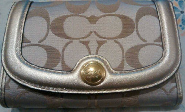 Coach style number- F48465 Legacy Signature Compact Clutch Wallet (Brand New) Description: Signature fabric with leather trim, crafted from coated canvas and trim and Color is Beige jacquard with goldtone metallic leather trim. Front flap has snap closure with Coach logo snaphead. Inside is goldtone me...