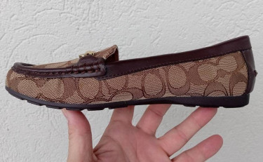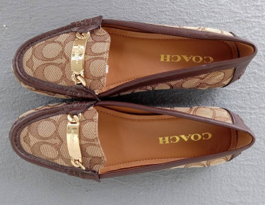 NEW + UNWORN-- Check the photos as this pair is a pristine pair that went from the Coach store in Ft Lauderdale, to the closet to listed here. CLASSIC COACH LOAFER/DRIVING SHOE/MOCCASIN IN SIGNATURE C PATTERN LEATHER TRIM/HEEL/TOP EDGE/INSIDE LINING + INSOLE GLEAMING GOLD COACH PLATE IN FRONT NEW + UN...
