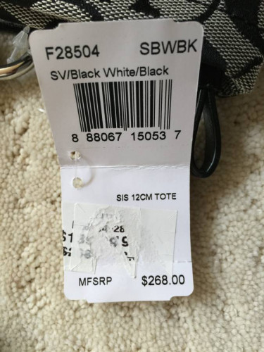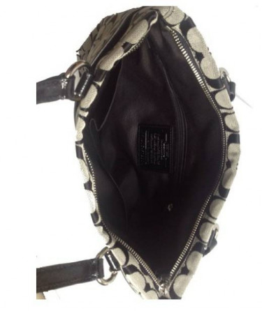 This listing is for a BRAND NEW WITH TAGS Coach Signature Stripe Tote Shoulder Bag, Style 28504, Color: Black & White. Details are: - 10.75" high - 14" wide - Signature C fabric print with black patent trim and silver tone hardware - Lined interior with zippered pocket, pen slot and two open slip...
