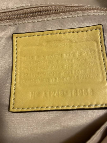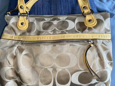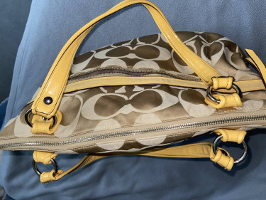 Smoke-free home Pet-free home Cloth Coach Purse with Signature C Insignia 15" long at bottom 4" deep at bottom 29" zipper at top 13" high Will accept PayPal transaction if buyer wants the purse sent