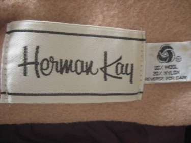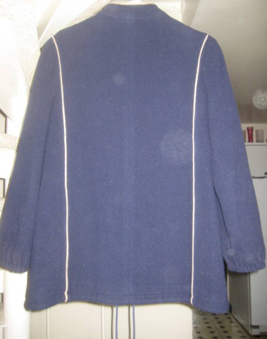 Navy blue womens coat. Navy blue with beige piping design. No size tag, but fit like size Medium. You can try it on. 80 percent wool and 20 percent nylon. 31 inches from top of neck to bottom. Herman Kay. Fully-lined with lining in perfect condition. Some minor imperfections on surface are not noticable. Draw...