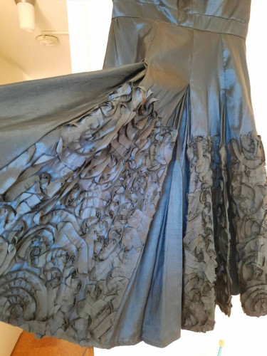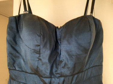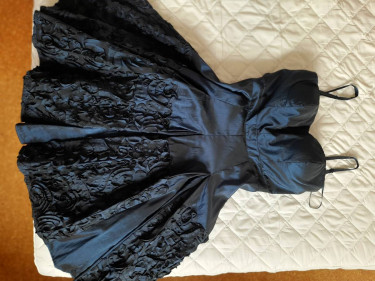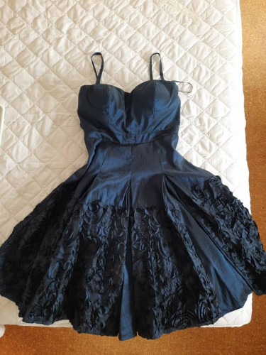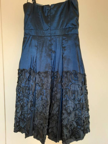 Brand new/never worn blue cocktail dress Size 8. The material looks like silk and embroidery. The lining has some ruffle to increase skirt volume. The straps are removable and the interior has a rubber band along the top to help to keep the top in place. This beautiful and well made dress is perfect for any...