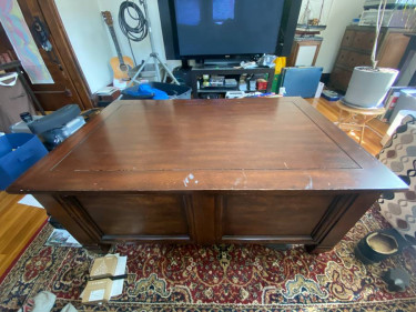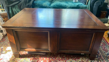 Nice heavy duty coffee table, solid excellent wood. Great for storing books and other things (books not included) There are some marks on surface and edges. 42"x27" surface and 19" tall $60