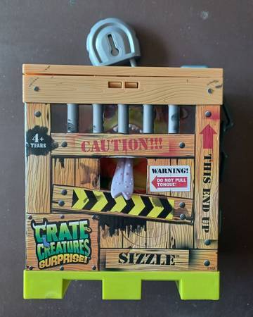 Crate Creature Surprise Sizzle Free your beast trapped in the Crate. Use the included crowbar to break the lock and open the case. Pull his tongue and he will vibrate and you'll hear monstrously fun sounds and gross. Tested, works, needs 3 batteries. Pre owned. Bookmark and follow me for man...