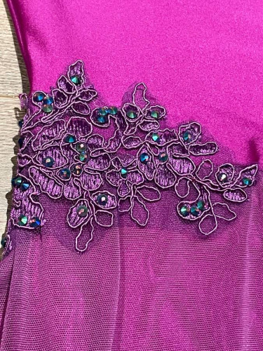 This purple 1-piece costume was custom designed and made by THE LINEUP in USA for dance competition. It would be great for ice skating or solo dance competitions, theater performances, Halloween costumes, etc. Adult Medium. Features a built-in leotard and stretchy fabrics for comfort and ease of movement...