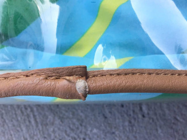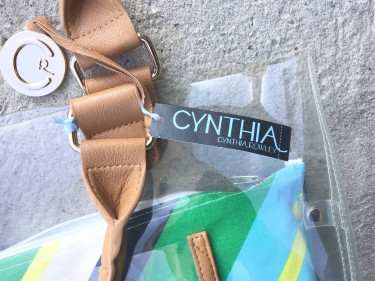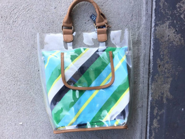 Cynthia Rowley Harbour Navy Canvas Diagonal Stripe Clear Plastic Tote Bag. Brand NEW with tags and metal brand name attached. List price $110. This plastic, (with leather handles) tote comes with a blue, green, yellow and white diagonal striped bag that can be removed or snapped inside. This colorful inside b...
