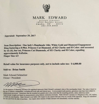 Handmade Diamond Engagement Ring from Mark Edward Private Jewelers - 14k white gold and 1.55 carat diamonds, featuring a 0.90 carat Princess Cut diamond (SI2 Clarity and II Color). Accented by six (6), bar set, Princess Cut diamonds (SIl Clarity and I Color), equaling approximately 0.65cttw. Can b...