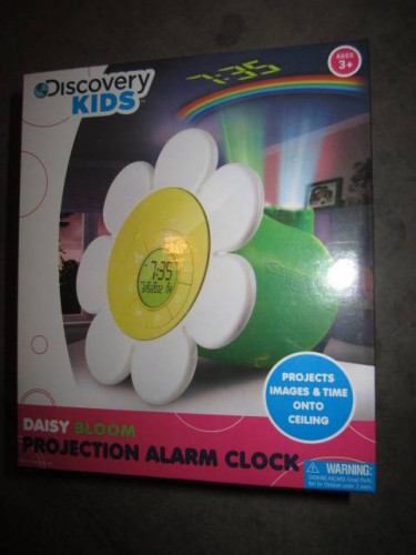 this is a Discovery Kids New in Box Daisy Bloom Projection Alarm Clock Features: Daisy Shaped Digital Clock 4 Serene Nature Scenes with the Option to Project Time Dual Pivoting Lenses Project Images up to 4 Feet Wide up to Ten Feet Away 12/24 Hour Clock with a Built-in Audible Alarm Year, Month, Date ...
