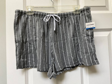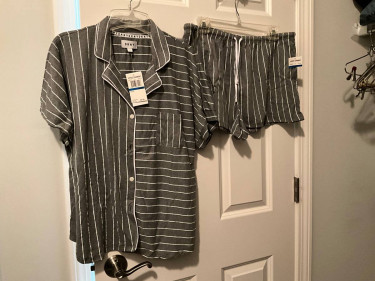 DKNY New York women’s short pjs in size XL in light gray and white stripes, 94% polyester, 6% spandex, is extremely soft. Top is button front with notched collar, short sleeves and one chest pocket; shorts have elastic waist with drawstring to adjust for comfort. Brand new with tags on. Retail price $64.