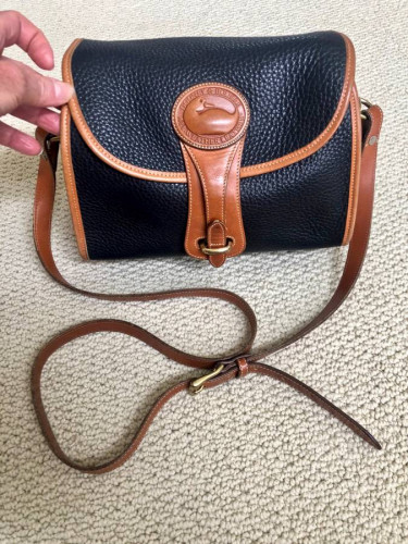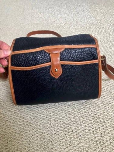 This genuine All-Leather Dooney and Bourke navy and British tan shoulder bag is part of the popular 'Equestrian' series. This beautiful pebbled navy "All Weather Leather" with British tan piping comes with the traditional brass duck fob, brass fittings and feet, and stamped leather duck closure. I purc...