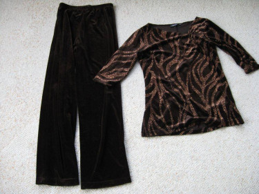 Size 8 Petite. Fancy brown velvet outfit a lot of bronze colored glitter on the top. Great for weddings etc. PICK UP ONLY.