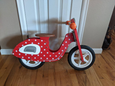 Dushi Janod Wooden Kid's Balance Bike- Strider. Perfect CLEAN Condition. Some scratches as it is wood and one small chunk out of the front but really isn't noticable. Shows NO wear on the air filled tires. They even have the knobbies on them! Looks new and works as such. Tires hold air, seat has a small ...