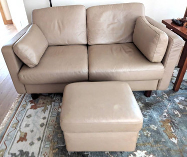 Six year old beige leather Eknornes Stressless "Emma" sofa with detachable chaise lounge (or called long seat). Perfect condition. Extra arm pillows. Ottoman with storage compartment. Sofa can be used connected to the chaise lounge or used separately. Arms detach so that chaise can be used on either end. ...