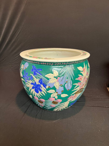 This colorful planter is a great way to add a pop of color to any patio. It features a verdant floral motif that surrounds the round base on an almost emerald dark green background. Scenes reminiscent of a jungle are of pink and green leafy flowers, lush green foliage and deep blue petals. Around the lip on t...