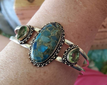 There are two Fancy Stone adjustible cuff bracelets available. Bracelet One: Large drop shaped prehinite stone with lots of rutilation with fancy birds on the side. $35 Bracelet Two: Large turquoise chip oval centerpiece with drop shaped Peridot Stones on the sides. $35 If You Buy Both I will sell both fo...