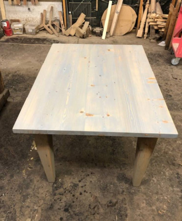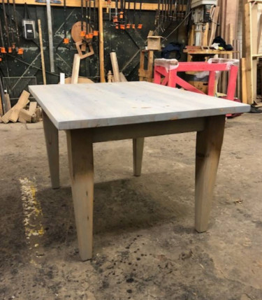 Up for sale: A gorgeous handmade and one of a kind farm table. 36" X 48" Table top has a light driftwood stain. Wood is beautiful - natural knots and blemishes are visible - pictures don't do it justice. It's a very beautiful and extremely well made table. Table is in like new condition! Also inclu...