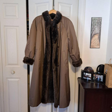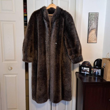 This is a reversible full length (comes to my mid-shin) 49" long (top of collar to bottom of coat) faux fur coat. There are no tags, as it is fully reversible, but it feels like an XL on me (I'm a L). This was barely worn by my Mom, only used for special occasions, and she was an XL when she was wearing this....