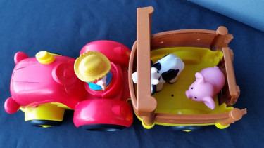 Fisher-Price Little People Tow 'n Pull Tractor playset farm Toy Toddlers can press down on Farmer in the seat to hear a fun tune. So load the pig and cow on the tractor and get moo-ooving The farmer fits in the driver’s seat of the tractor The tail gate opens up and becomes a ramp for the farm animals Lo...