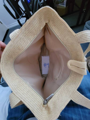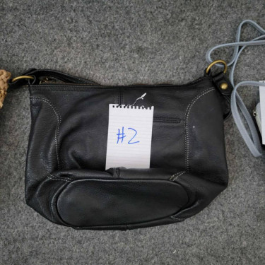 #1 10"x16” Natural fiber purse or bag. Leather straps. Pocket inside. Lined. #2 13"x10” Famous “The Sak” purse. Very popular at one time. Black leather with white stitching. Top zipper close with several pockets on outside. One lined pocket inside. Inside completely lined. #3 7"x7” Medium dove gr...