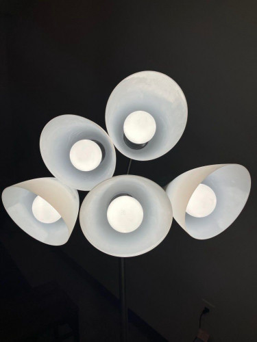 Five shade floor lamp with adjustable necks Brushed steel finish Dimensions: 8" x 10.5" x 72", 13.3 lbs Bulbs included.