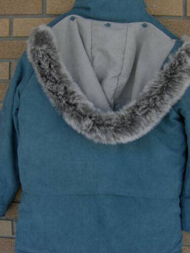Forecaster of Boston - Microsuede Medium Blue Hooded Jacket - in Mint Condition. Petite Small - Removable hood has grey Faux fur trim. Jacket zips to the top of the stand-up collar. Also has button closing. One interior pocket has a small bag containing two extra buttons. Two side pockets covered by a fl...