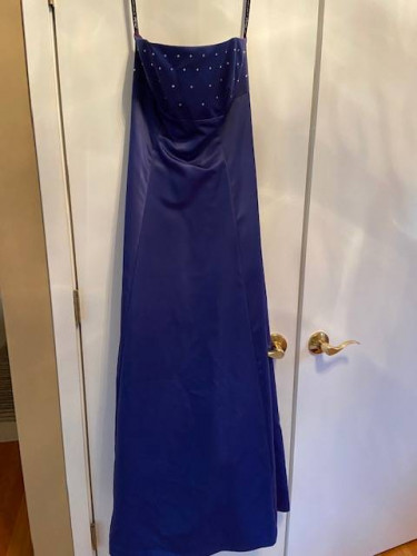 Navy Blue Satin Formal, Prom, Evening Dress, Strapless, Size 11/12, Rhinestones. Stunning navy blue satin strapless A-line long gown. Size 11/12. The top of the dress is encrusted with rhinestones, and there is a black organza lining. The designer brand is Zum Zum by Niki Livas and was purchased at a hi...