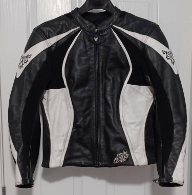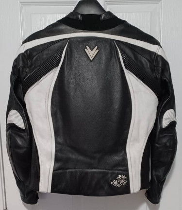 This is an excellent jacket from one of the UK's oldest motorcycle gear manufacturers. Size is confusingly listed as "UK 16 / EU 42." Their sizing information indicates this is an XL meant for a 40" bust (around the rib cage). Features: Leather! with stretch material on the inside of the arms and below ...