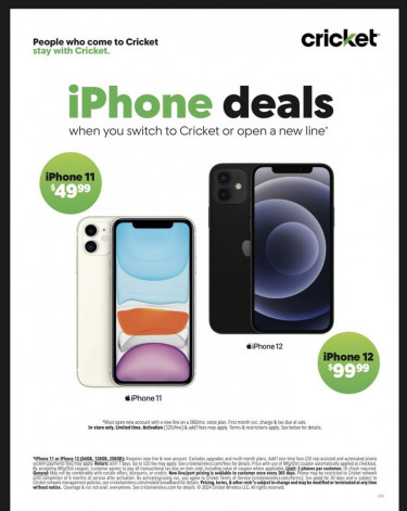 HEY GD FROM CRICKET HAPPPPPPY HUMP DAY LET TALK ABOUT ALL THIS GREAT DEALS THAT CRICKET HAVE GOING ON WE HAVE THE IPHONE 11 FOR ONLY $29.99 AND THE IPHONE 12 FOR ONLY $79.99 WHEN U SWITCH UR NUMBER OVER TO CRICKET WE ALSO HAVE THE IPHONE 11 FOR ONLY $49.99 AND THE IPHONE 12 FOR ONLY $79.99 FOR NEW CUSTOMERS ...