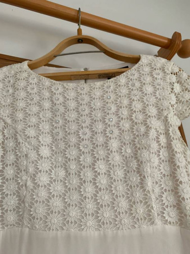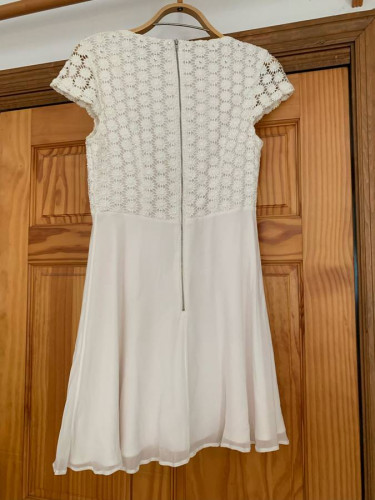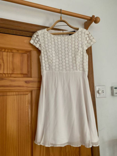 French Connection Young Lady Party Dress Size US 8 Teen It has short cap sleeves. It is white. The top of the dress is in cotton lace with rhinestones. The lower body 100% viscose/rayon. Lining is 100% polyester. Size US 8 Teen / UK 12 / FR 40. It has silver zipper on the back. Good for 14 - 16 yea...