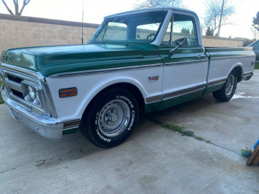 1972 GMC sierra C 10 pick up an original short bed from the factory or V8 350 automatic, manual windows manual locks, rebuild motor runs and drives great sounds very nice. New exhaust gas tank relocation to under bed. Has a cheap paint. Job looks decent....