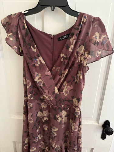 Gorgeous lilac flowered floor length Ralph Lauren evening gown with sheer cap sleeves and crossed design at top. 5 sheer ruffles at the bottom of the dress make it a statement piece. Size 8 worn once to a wedding. Originally paid $285.