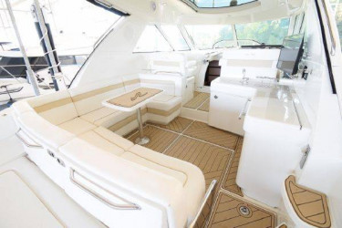 The 450 Sundancer advances Sea Ray's tradition of forward thinking with innovative and trend-setting features like its standard Axius propulsion system with joystick control, a fiberglass hardtop with retractable sunroof, a cockpit entertainment center with optional grill and TV, and a designated "media room"...