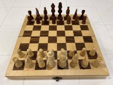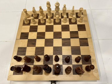 Downsizing senior selling off my extensive chess set collection This one is a more traditional set contained in a light wooden bi-folding box held shut with a latch The inside of the box is lined with felt and the players are made of real wood and all have felt bottoms The playing board measures 10.2...