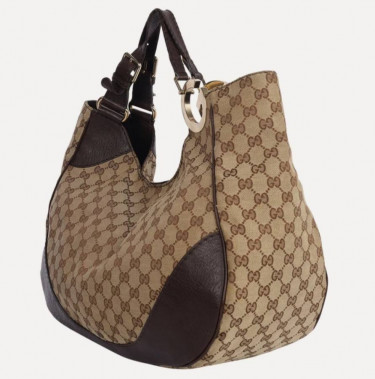 Authentic. Pre-owned Brown logo Charlotte GG Canvas Hobo Bag. Features: Brown GG logo print with leather accent, gold hardware, large double GG, magnetic snap-top closure, brown textile interior lining with zipper slip pocket and patch pocket, flat leather adjustable handle strap. Only needs to add your wa...
