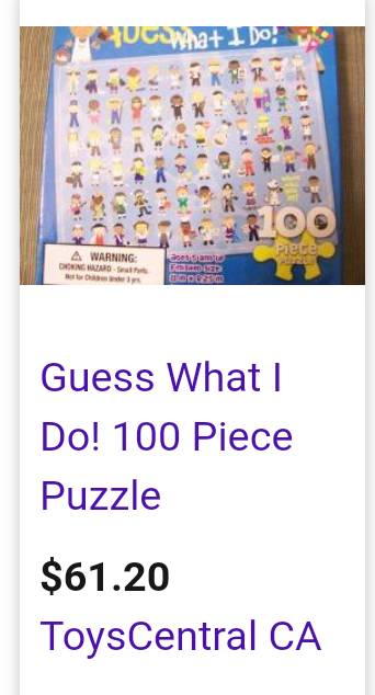 Rare! Great gift! ;) Fun way to teach kids about jobs and occupations *Great to frame for a career counselor's/teacher's wall! ;D Challenging 100 pieces Finished puzzle measures 11" by 8.25" Contains ALL pieces! Ages 6+ (4+ if supervised) $6 firm *See comps ($9-$61+, plus shipping!!); not available...