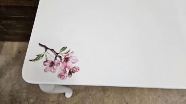 Hall table Painted with Heirloom Traditions paint in white. ( under paint the top is laminate and legs are wood. Its a sturdy table) Flower design is a transfer and top has a clear coat on for extra protection! 50 inches long 18 inches deep 28 inches high. Check out the rest of my furniture and if you have...