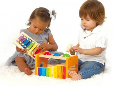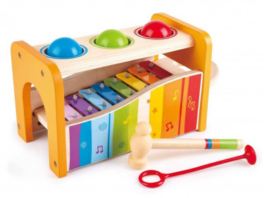 Brand new pound and tap xylophone musical toy plus tambourine with mirror and 2 shakers. Great for babies to 3 years!! Comes in original box. I included the extras in the box. Hape's Pound and Tap Bench with Slide Out Xylophone is a multifunctional musical delight and sound experience for toddlers. ...