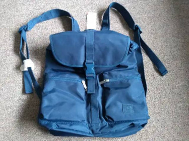 NWT 100% Nylon Adjustable webbing shoulder straps and casual style Webbing top handle Two zippered pockets on front exterior and one interior zippered pocket Main compartment has drawstring closure and top flap that secures with bayonet clip Matte silver tone hardware. Dimensions: 15.9" x 5.3" x 11.8"