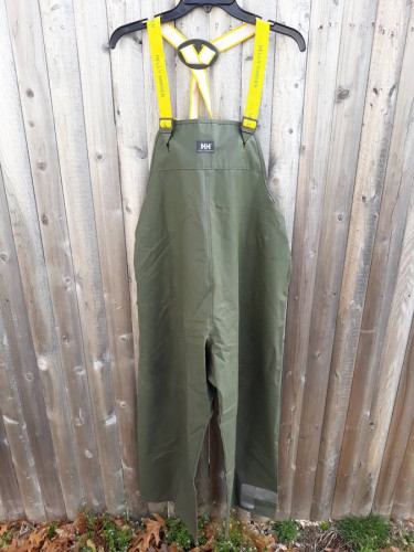 Includes both Men's Jacket (Large) and Bib Pants (Medium). Both are used but in overall very good condition. One pant leg had a tear (see picture) but not really an issue. Both top and bottoms are Heavy-Duty Protective Polyester/Polyurethane, and fully waterproof.