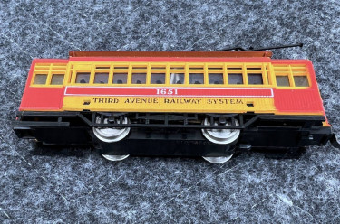 Mid-1970s vintage HO-scale Birney trolley "1651 Third Avenue Railway System" by AHM, made in Yugoslavia. It has nice color, lights up, and ran well when last tested. Makes a nice easy addition to any HO model railroad. Comes with original box and paperwork. Also have several Lionel O-gauge rolling sto...